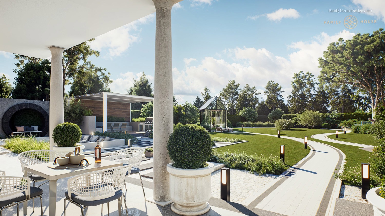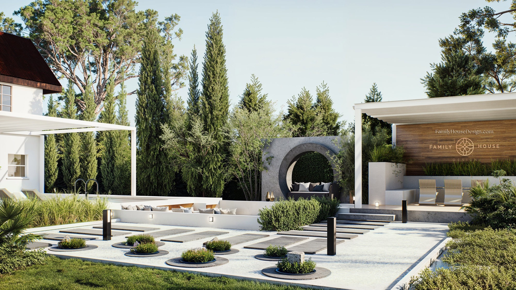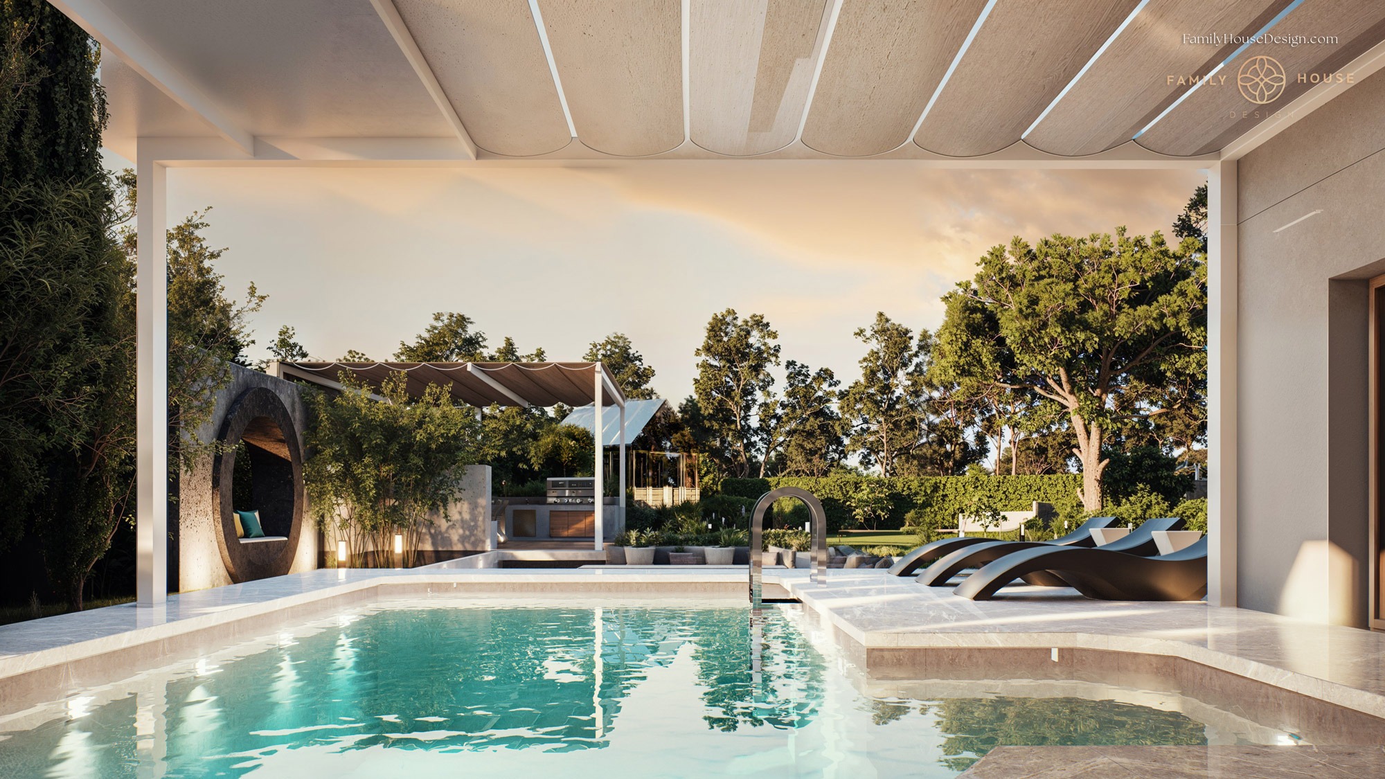 Crafted for seamless continuity, our garden and landscape project embodies a harmonious flow of design elements. Within this exquisite setting, we envisioned and designed not just a pool and leisure area, but also a sophisticated barbecue zone complete with a cutting-edge bioclimatic pergola. As an integral part of the composition, we incorporated a thoughtfully designed shed and a greenhouse, ensuring that every facet of the outdoor space complements the overall aesthetic. From the fluid lines of the pool to the purposeful placement of the leisure area and the innovative features of the barbecue zone, our design creates a unified, organic whole that seamlessly integrates functionality and elegance.
